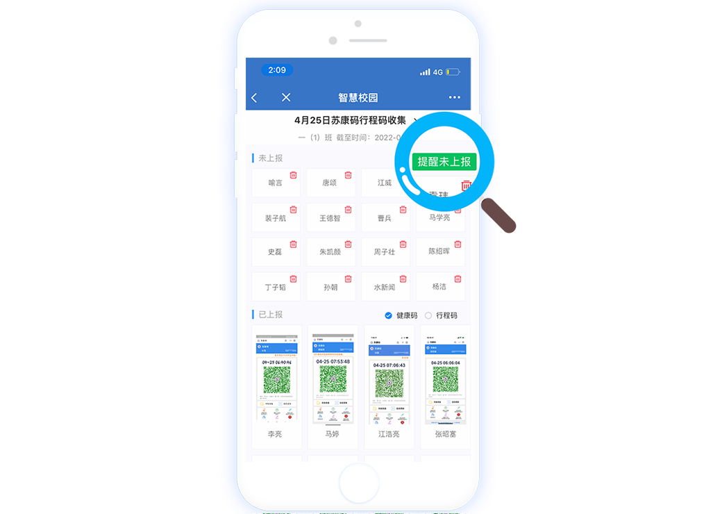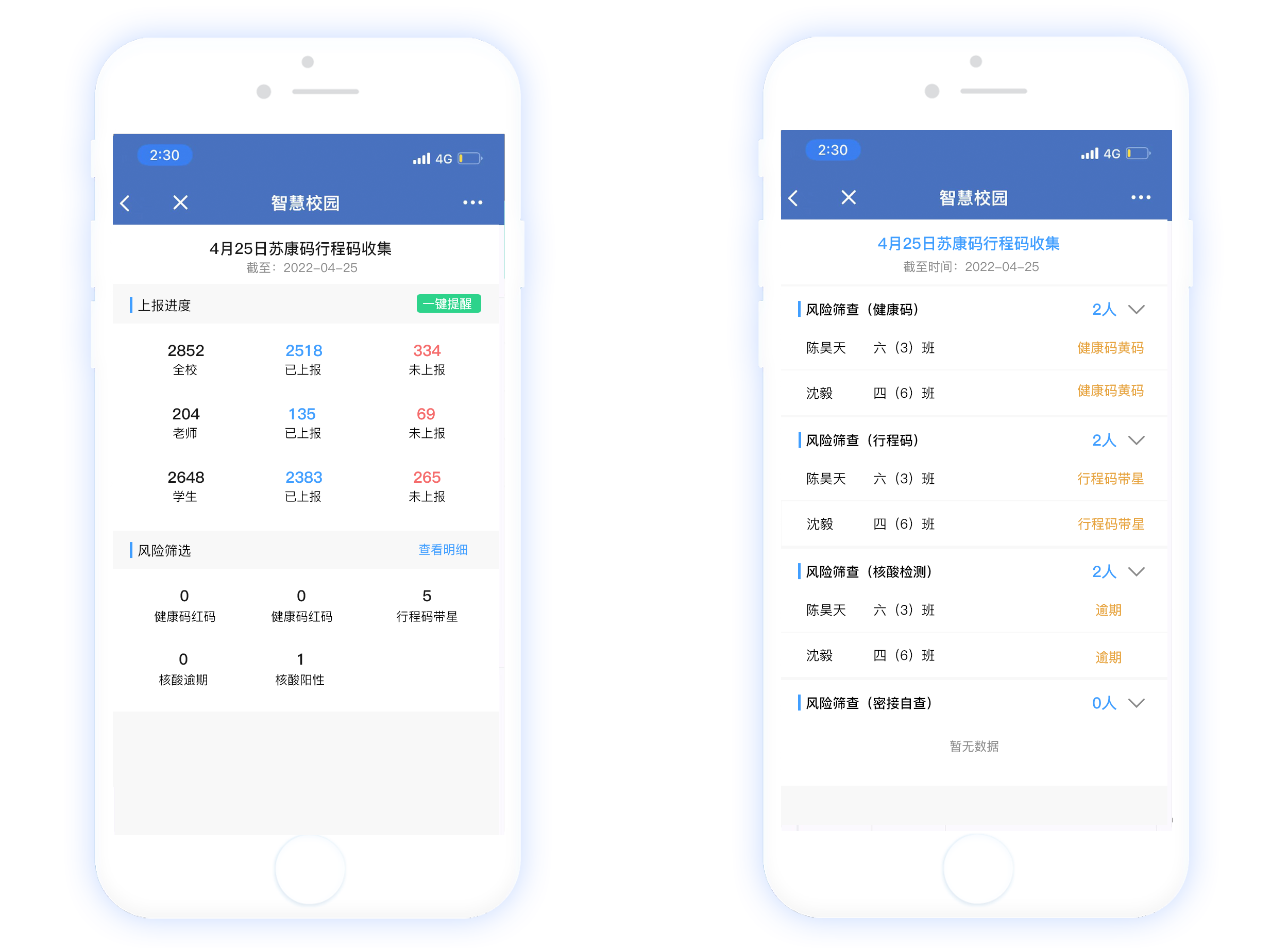 支持實時(shí)查看(kàn)全校(xiào)師(shī)生(shēng)的(de)上(shàng)報(bào)進度
