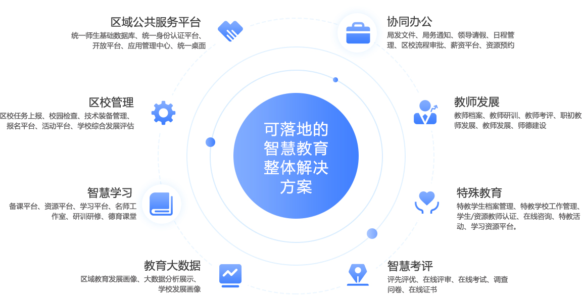 基于優勢教育理(lǐ)念,充分(fēn)運用(yòng)互聯網、物(wù)聯網、大(dà)數(shù)據、人(rén)工(gōng₹)智能(néng)等現(xiàn)代先進技(jì)術(shù),構建以統一(yī)平台為(wèi)基礎,緻力于打造完整的(de)教育生(shēng)态體→(tǐ)系,提供智慧教育一(yī)體(tǐ)化(huà)解決方案。為(wèi)教育主管部門(mén)提供教學考評、教育質量監測和(hé)教育決策支撐等,為(wèi)學校(xiào)提供智 慧教學環境、智慧教學資源、智慧校(xiào)園管理(lǐ)和(hé)智慧校(xiào)園服務,為(wèi)學生(shēng)及家(jiā)長(cháng)提供個(gè)性化(huà)學習(∑xí)和(hé)家(jiā)校(xiào)溝通(tōng)渠道(dào),最終建成促進學生(shēng)、教師(shī)、學校(xiào)、區(qū)域優勢發展的(de)智慧教育生(shēng")态。