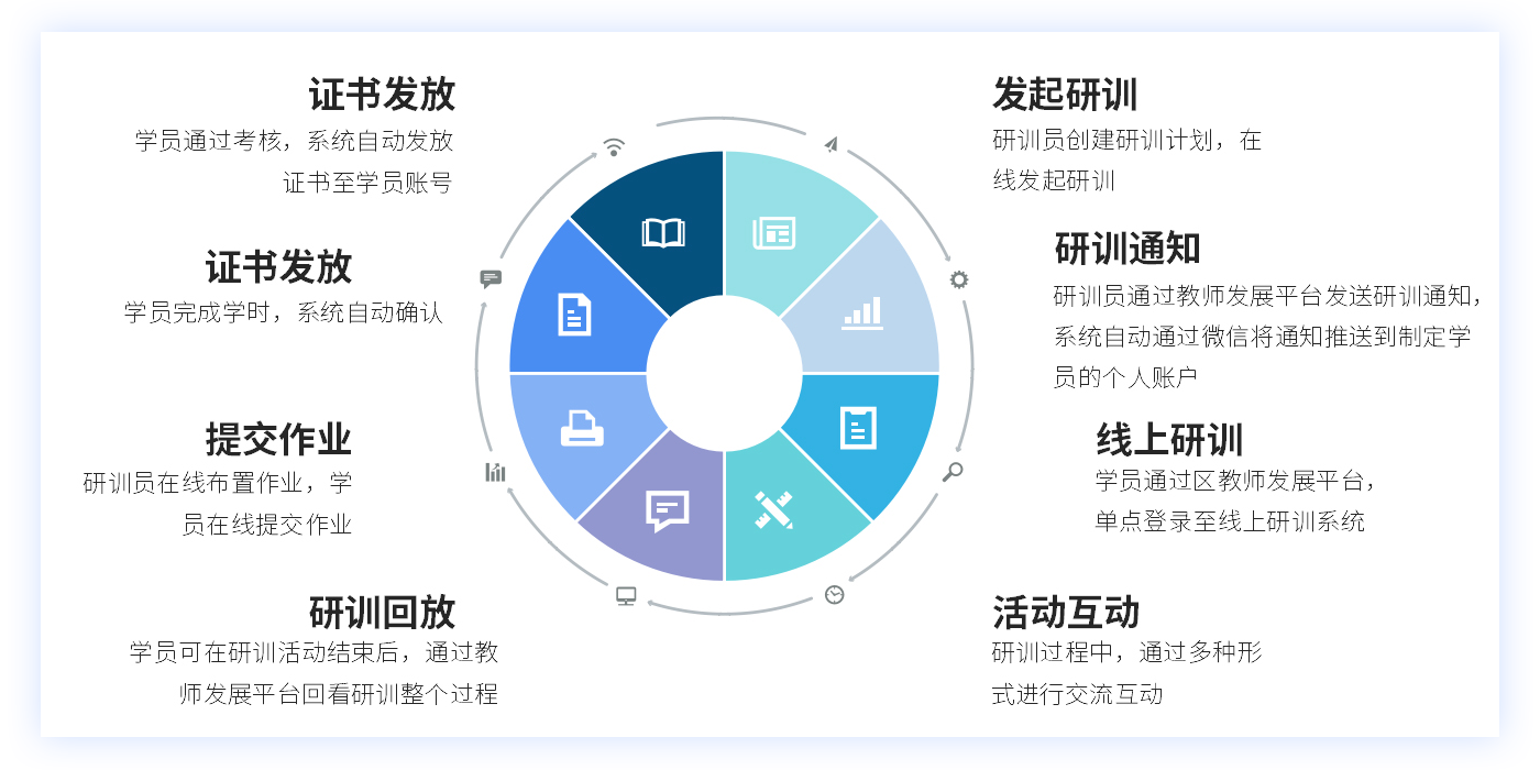提供專家(jiā)講座、教材分(fēn)析、各種會(huì)議(y∞ì)等一(yī)般教研活動的(de)活動征集、活動發起、報(bào)名、邀請(qǐng)、審批、活動過程跟蹤、討(tǎo)論、分(fēn)享、成果記錄以及成果資源推送"功能(néng);研訓活動管理(lǐ)平台可(kě)以把教師(shī)線下(xià)專題培訓、遠(y∑uǎn)程培訓、校(xiào)本培訓、公開(kāi)課、教學研討(tǎo)等研訓活動等基于網絡化(huà)管理(lǐ),便于教師(shī)發展中心的(de)研訓活動管理(l™ǐ),也(yě)能(néng)夠全方位的(de)了(le)解教師(shī)參與研訓活動情況。